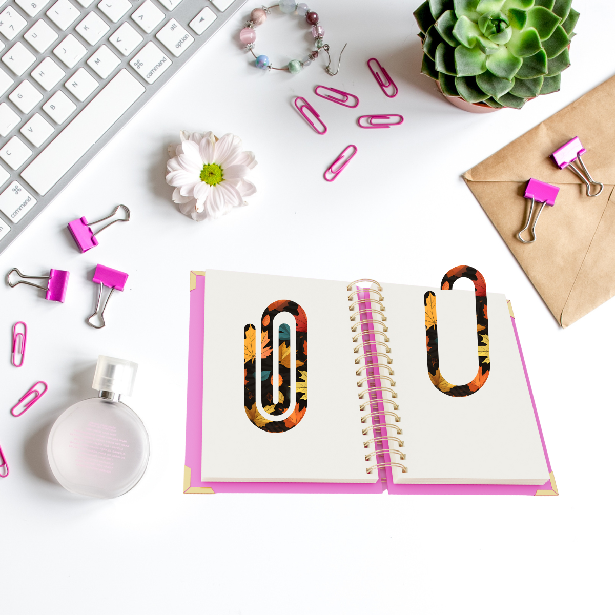 This paperclip design is filled with a vibrant pattern of autumn maple leaves in rich shades of orange, yellow, red, and brown against a dark background. Perfect for celebrating the cozy fall season, this design turns a simple office essential into a seasonal stationery accent. Ideal for planners, journaling, schoolwork, or craft projects, this autumn-inspired paperclip adds warmth and festive charm to any collection.
