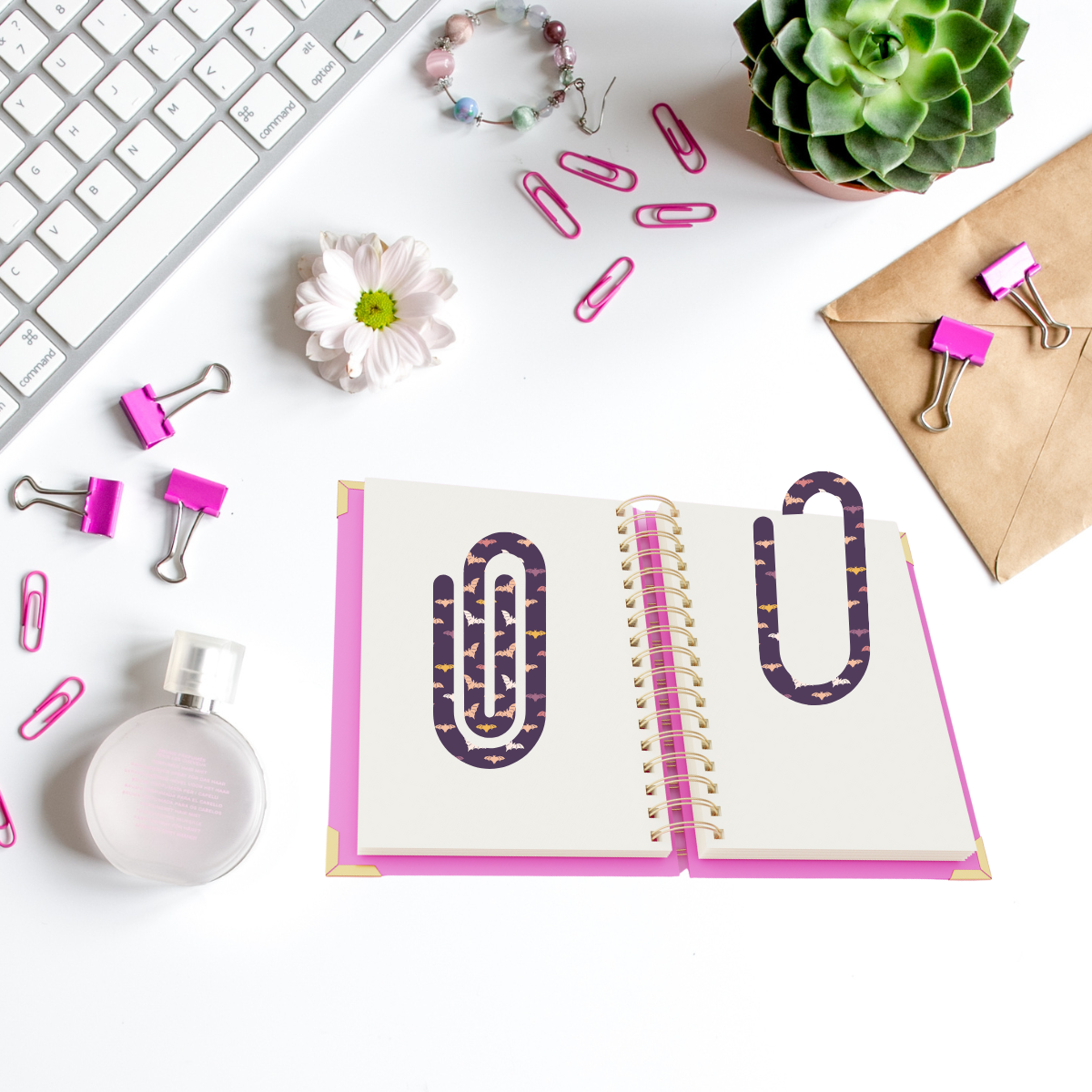 This paperclip design features a deep midnight-purple background adorned with flying bats in shades of orange and pink. With its spooky yet stylish look, it’s a perfect seasonal accessory for Halloween. Great for planners, journaling, school supplies, or craft projects, this bat-themed paperclip brings both functionality and festive charm to any stationery collection.
