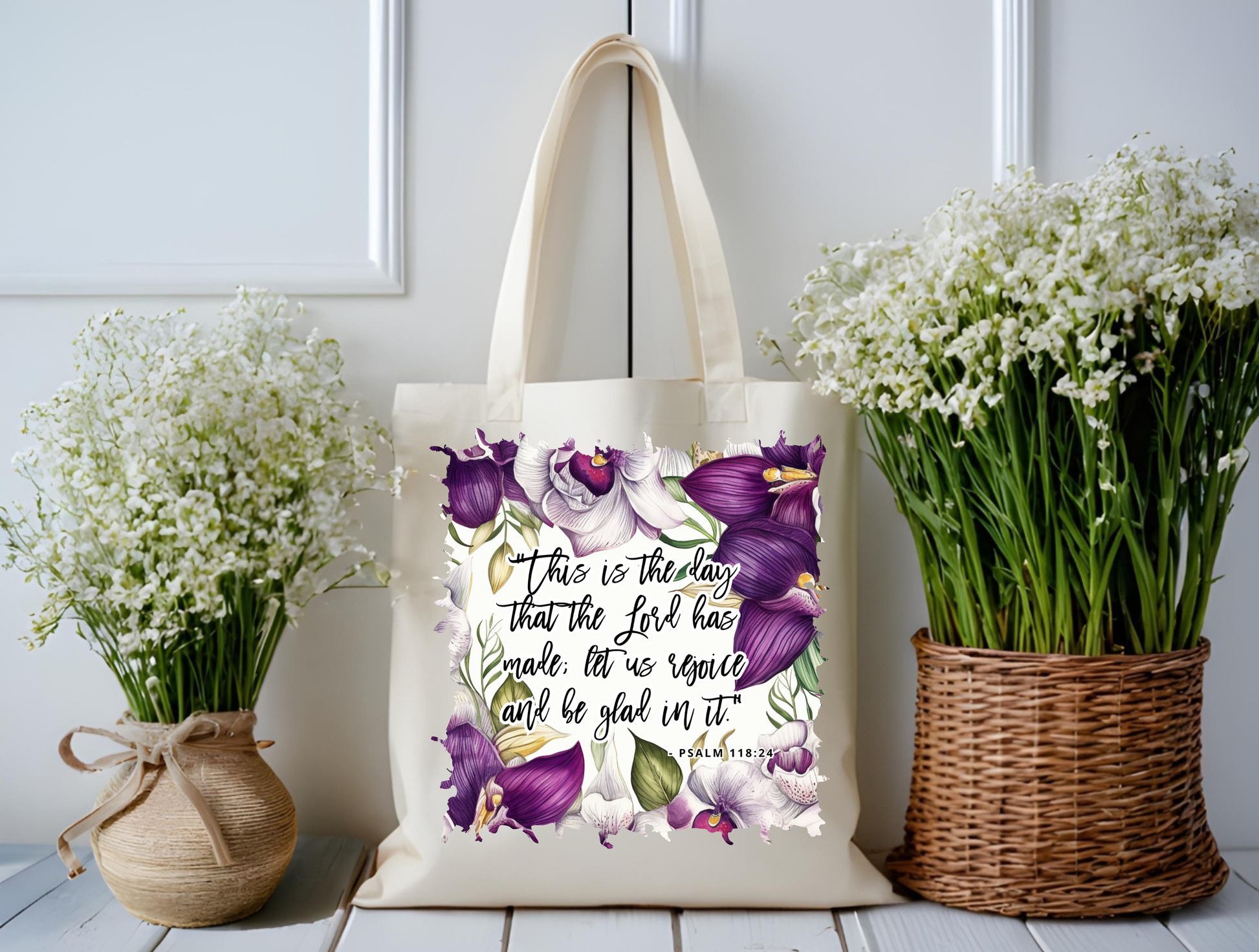 Start each day with gratitude, joy, and beauty with the Rejoice & Bloom Psalm 118 Tote Bag. This elegant tote features a stunning arrangement of deep purple, soft lavender, and creamy white flowers—framing the uplifting Scripture: