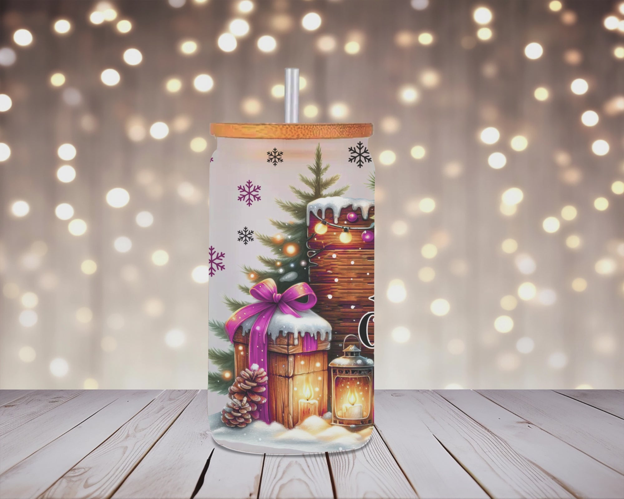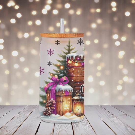 Add a touch of cozy holiday magic to your drinkware collection with our Frosted Lantern Wishes Christmas Glass Can. This 16oz frosted glass can features an enchanting winter scene filled with glowing lanterns, snowy wooden gifts, twinkling lights, bright pink bows, and a cheerful snowman wrapped in warm winter gear. Every detail sparkles with Christmas charm, making this the perfect festive cup for the season.