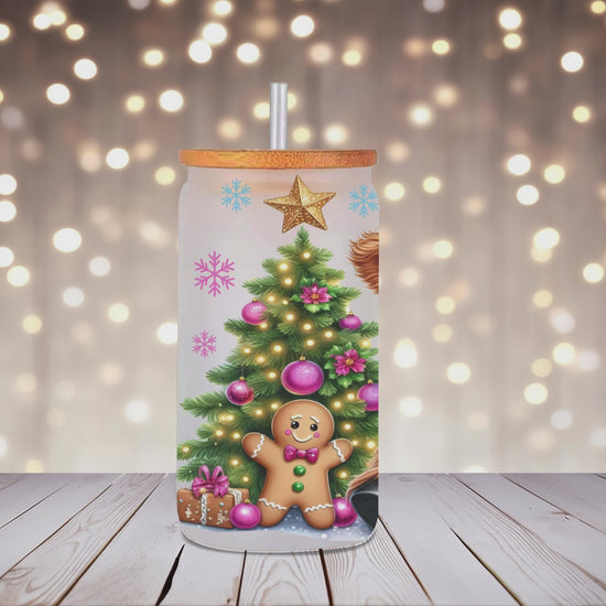 This festive frosted glass cup features an adorable trio of Christmas favorites—a sparkling decorated tree with a gingerbread cookie friend, a cozy snowman in a pink-plaid scarf, and the star of the show: a super-cute Highland cow wearing a leopard-print bow and matching scarf. Each design is vibrant, cheerful, and full of personality, making every drink feel like a warm holiday hug.