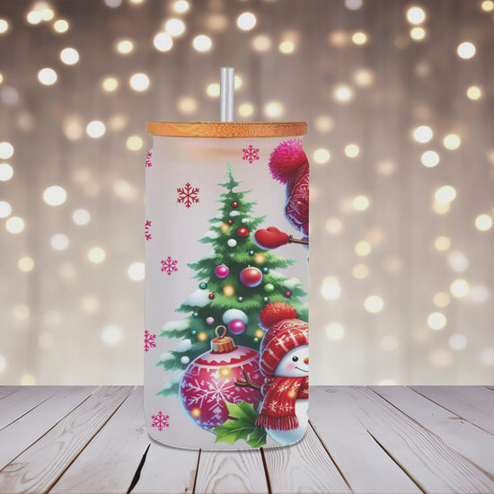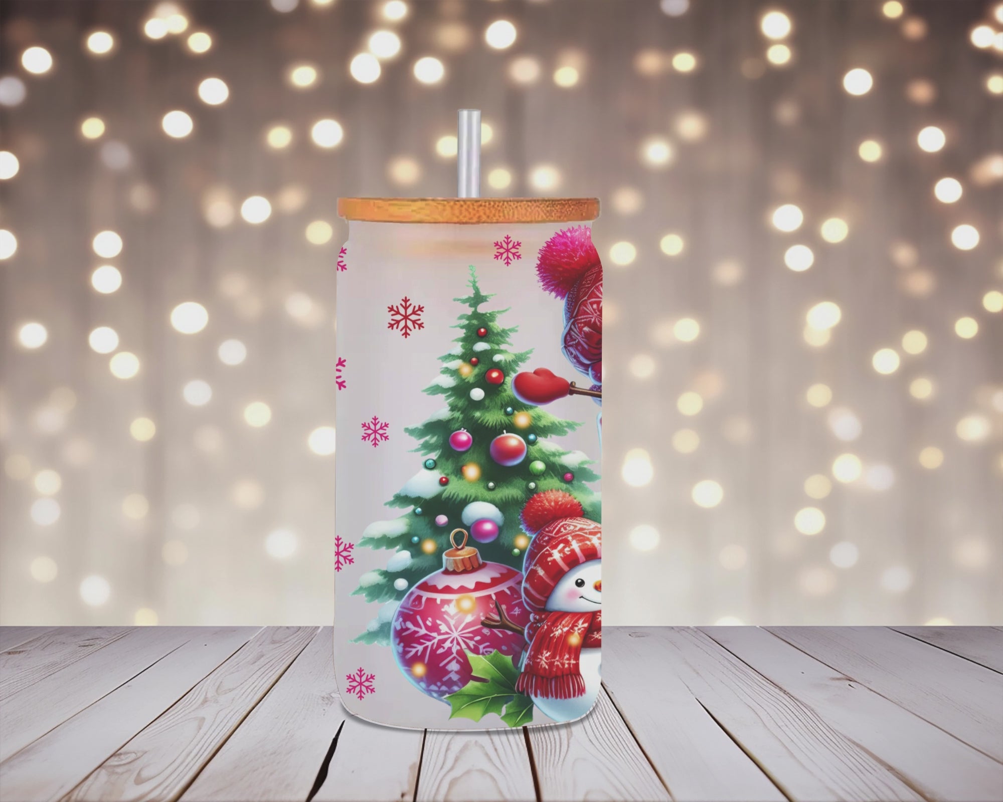 Bring the joy of the holiday season to every drink with our Snowy Sips Christmas Cheer Glass Can—a festive, heart-warming addition to your winter drinkware collection. This beautifully designed frosted glass can features an adorable Christmas scene filled with cheerful snowmen bundled in cozy winter hats, vibrant Christmas trees decorated with colorful ornaments, and classic holiday details like candy canes and shiny baubles.