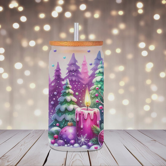 Bring a touch of magical winter wonder to every sip with our Whimsical Winter Snowman Glass Can. This enchanting frosted glass can is wrapped in a dreamy holiday scene featuring a sweet smiling snowman dressed in a cozy hat and scarf, surrounded by pastel pine trees, glowing candles, vibrant ornaments, and a bright red cardinal perched in the snow. The soft color palette of purples, pinks, aquas, and winter greens creates a charming fairy-tale aesthetic that feels warm, festive, and irresistibly joyful.